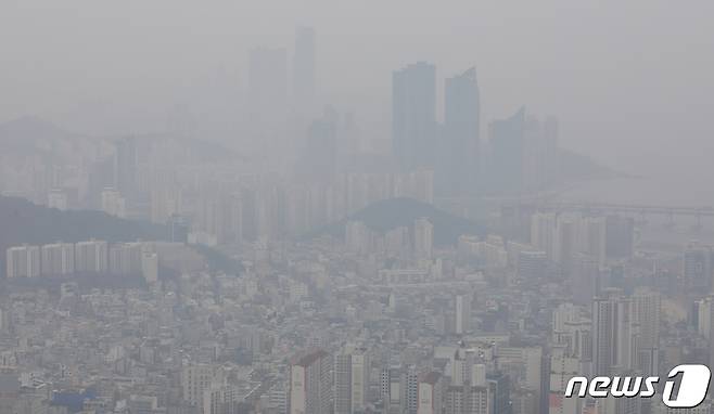 (부산=뉴스1) 여주연 기자 = 20일 오후 부산 황령산 전망대에서 바라 본 해운대 일대 도심이 미세먼지에 뿌옇게 보이고 있다. 이날 부산은 미세먼지 '나쁨', 초미세먼지 '나쁨' 또는 '매우 나쁨' 수준을 보였다. 2019.3.20/뉴스1