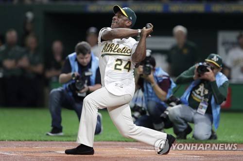 epa07450007 Former Oakland Athletics and Baseball Hall of Fame player Rickey Henderson (C) reacts during the ceremonial first pitch by former Seattle Mariners player Kazuhiro Sasaki (unseen) prior to the start of the the first game between the Oakland Athletics and the Seattle Mariners during the Major League Baseball (MLB) Opening Games at Tokyo Dome in Tokyo, Japan, 20 March 2019. EPA/KIYOSHI OTA