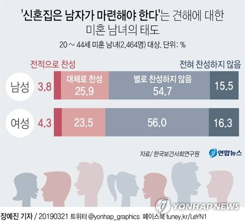 21일 한국보건사회연구원의 '2018년 전국 출산력 및 가족보건·복지 실태조사' 결과에 따르면 20~44세 미혼남녀 2천464명(남 1천140명, 여 1천324명)을 상대로 '신혼집을 남자가 마련해야 한다'는 견해에 관해 물어보니, 미혼남성 70.2%가 별로 찬성하지 않거나 전혀 찬성하지 않는 등 부정적으로 답했다.