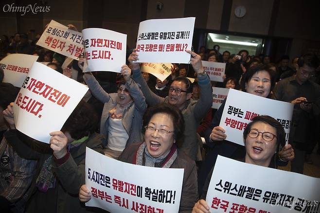 | ▲ 대한지질학회 주최로 20일 오전 서울 중구 한국프레스센터에서 열린 '포항지진과 지열발전의 연관성에 관한 정부조사연구단 결과발표 기자회견'에서 포항 시민들이 포항지진이 인근 지열발전소와 관련이 있다는 결론이 나오자 환호하고 있다. |