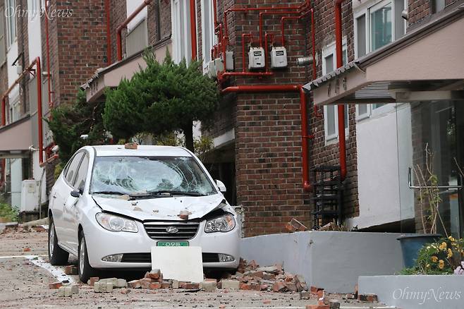 | ▲ 지난 2017년 11월 15일 발생한 포항 지진으로 대동빌라 주차장에 부서진 자동차가 그대로 방치돼 있다. |