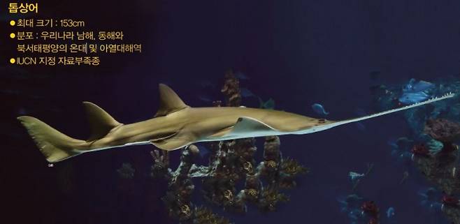톱상어는 가장 얼굴이 긴 상어입니다. 길고 뾰족하며 가장자리에 이빨이 달린 주둥이가 인상적입니다. 주둥이는 원래 모래 바닥에 숨은 먹이를 찾는 용도로만 사용한다고 알려져 있었습니다. 2012년 호주 서호주대 동물생물학부 바바라 위링어 교수 연구진은 톱상어가 톱처럼 생긴 주둥이를 휘둘러 먹잇감을 두 동강 내는 장면을 목격했습니다. 연구팀이 죽은 송어를 먹이로 주자, 톱상어는 주둥이로 송어의 측면을 빠르게 후려쳐 주둥이에 난 이빨로 찔렀습니다.