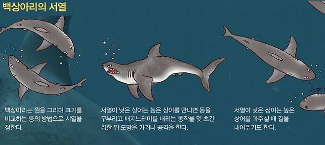 서열은 불필요한 싸움을 막는 역할을 합니다. 사냥감을 두고 힘이 센 상어끼리 싸우면 피해가 큽니다. 그러나 서열이 정해지면 서열이 낮은 상어가 순종적인 모습을 보여 싸움이 나지 않습니다. 상어 가족의 실제 모델인 백상아리는 보통 혼자 지내지만, 일부는 무리를 지어 사냥합니다. 이때 무리가 만드는 서열은 대체로 암컷이 수컷보다 높습니다. 캐나다의 생물학자 아이단 마틴과 앤 마틴은 2000년부터 8년 동안 남아프리카 씰아일랜드의 백상아리가 사냥하는 모습을 2500여 회 관찰해 크기가 클수록, 암컷일수록, 이 해역에 오래 머무를수룩 서열이 높다고 분석했습니다.