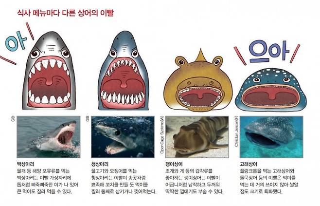 먼저 이빨입니다. 애니메이션에 나타난 할아버지와 할머니 상어는 이빨이 적거나 없는 모습입니다. 하지만 이는 잘못된 내용입니다. 나이가 들수록 치아가 약해지는 인간과 달리, 상어는 새로운 이빨을 계속해서 만들어 한 마리가 생애 동안 수천 개의 이빨을 씁니다. 시프먼 연구원은 자신의 글에서 “상어는 포식자이기 때문에 이빨이 없다면 아무것도 먹지 못하고 결국 죽게 될 것"이라고 적었다.