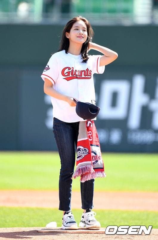 경기에 앞서 우주소녀 엑시가 시구를 하고 있다./sunday@osen.co.kr