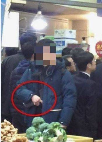 문재인 대통령이 대구의 재래시장을 방문했을 때 청와대 경호원이 심각한 표정으로 기관단총(사진 왼쪽 우지, 오른쪽 KP5K)에 손을 대고 있는 사진을 놓고 24일 하태경 바른미래당 최고위원과 청와대측이 공방을 펼쳤다.