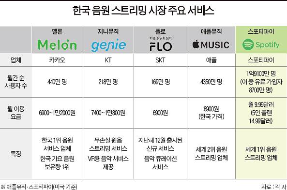 가입자 빼앗기 출혈 경쟁을 벌이고 있는 이 시장에 최근 세계 1위 음원 스트리밍 업체 스포티파이까지 나섰다. 스포티파이는 2008년 스웨덴에서 첫선을 보였다. 돈을 내거나 불법으로 다운로드받아 음악을 듣던 방식이 일반적이던 때, 언제든 사이트에 접속해 다양한 음악을 찾아 들을 수 있어 인기였다.