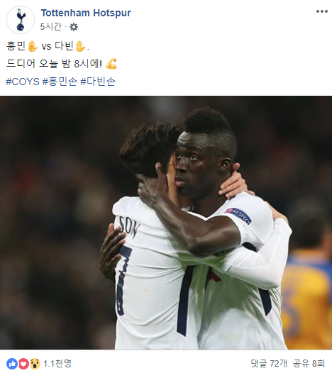 26일(한국시간) 토트넘은 공식 페이스북을 통해 다빈손 산체스와 손흥민의 사진을 올리며 "흥민(손) vs 다빈(손)"이라는 글을 게재했다.