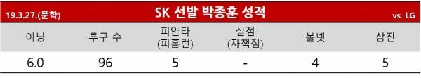 하지만 내용은 다소 아쉬웠다. 박종훈은 공격적인 피칭으로 유리한 볼 카운트 승부를 가져가면서도 이후 연이은 볼로 위기를 자초했다.