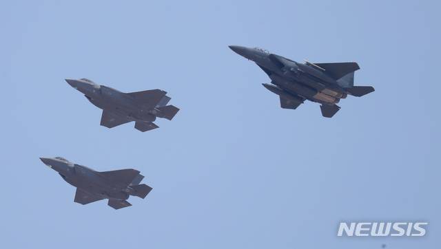【청주=뉴시스】강종민 기자 = 29일 오후 공군 청주기지로 스텔스기인 F-35A 전투기(오른쪽)가 호위를 받으며 도착하고 있다. 2019.03.29.