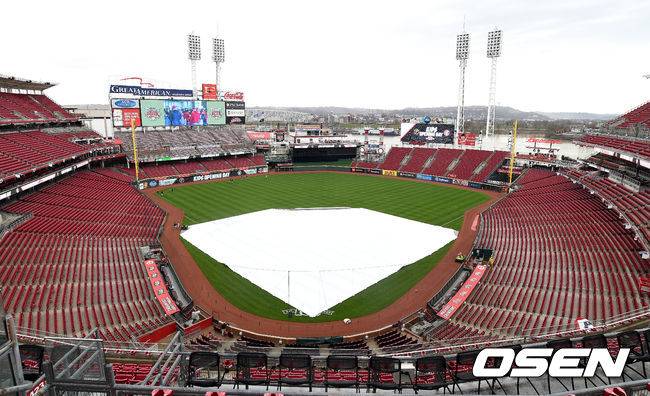 [OSEN=신시내티(미국 오하이오주), 최규한 기자] 31일(한국시간) 미국 오하이오주 신시내티 그레이트 아메리칸 볼파크에서 열리는 ‘2019 메이저리그’ 신시내티 레즈와 피츠버그 파이어리츠의 경기를 앞두고, 내리는 비에 그라운드 내야가 방수포로 덮여 있다. /dreamer@osen.co.kr