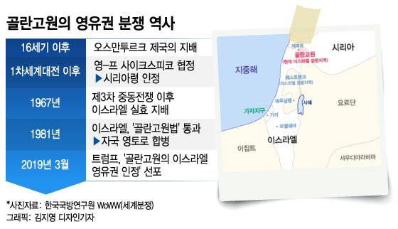 # 중동의 화약고로 불리는 골란고원에서 다시 포연이 타오를 기세다. 전쟁(1967년 3차 중동전쟁(6일 전쟁))을 통한 불법 점유를 비난받던 이스라엘은 52년뒤인 지난 3월25일(현지시간) 미국으로부터 자국 영토임을 공식 인정받았다. 곧바로 로켓 발사와 전투기의 폭격이 오갔다.