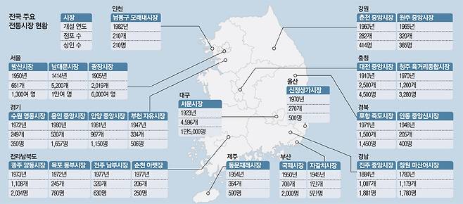 소상공인시장진흥공단에 따르면 전국의 전통시장은 통계가 처음 작성된 2006년 1610곳에서 매년 감소해 현재 1450곳(2017년 기준)으로 조사됐다. 지난 10여 년간 160곳 이상이 줄어들었다. 매년 전통시장 14곳 이상이 사라진 셈이다.