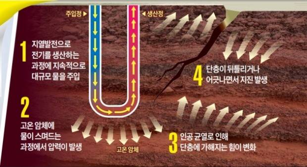 지열발전은 땅 밑 깊숙이 높은 압력의 물을 넣어 땅의 열로 데운 뒤 증기와 전기를 발생시키는 원리다. 이때 고압의 물이 지진 원인인 지하 단층을 자극했고 이것이 강진으로 이어졌다는 설명이다. 연구단은 2016년 1월부터 작년 9월까지 지열발전 작업 중 유독 물을 주입한 직후에 미소 지진이 일어난 사실을 확인했다. 미소 지진은 63차례 발생했다. 2017년 4월엔 중간 규모 지진으로 분류되는 3.1 지진이 일어나기도 했다.