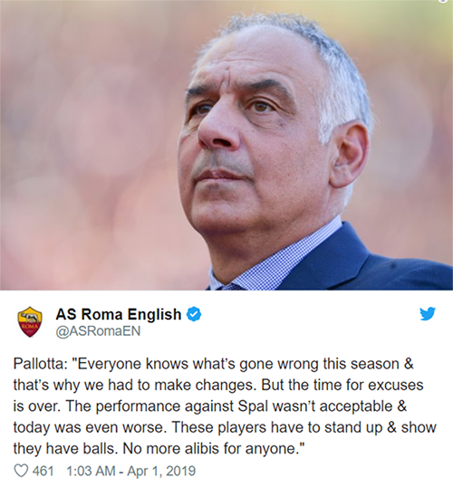 이에 팔로타 회장은 팀을 향한 불만을 드러냈다. 팔로타 회장은 구단 공식 트위터를 통해 “우리는 로마가 올 시즌 언제부터 잘못됐는지를 알고 있다. 팀에 변화가 생기면서 문제가 생겼다”며 팀을 향한 비난은 물론 지난달 초 팀을 떠난 에우세비오 디 프란체스코 전 감독, 몬치 단장을 겨냥했다.