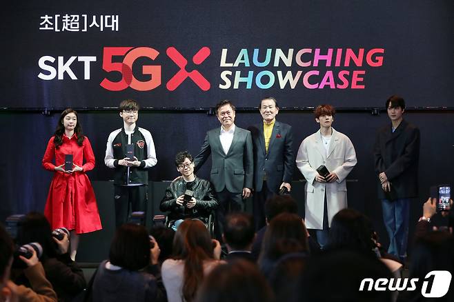 (서울=뉴스1) 이광호 기자 = 박정호 SK텔레콤 사장이 3일 오전 서울 을지로 SKT타워에서 열린 '5GX 서비스 론칭쇼'에서 명예홍보대들에게 갤럭시S10 5G 단말기를 전달한뒤 기념촬영을 하고 있다. 왼쪽부터 김연아 전 피겨스케이팅 선수, 페이커 이상혁, 뇌성마비를 극복한 수영선수 윤성혁, 박 사장, SK텔레콤 최장기고객 박재원 , 엑소 백현과 카이. 2019.4.3/뉴스1