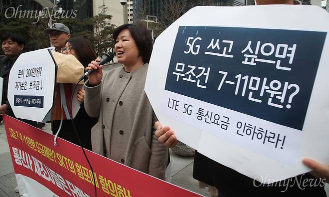 | ▲ SKT 횡포에 화난 소비자 “5G 시대, 국민 눈높이 맞게 요금 인하하라" 한국소비자연맹과 소비자시민모임, 민생경제연구소, 참여연대 민생희망본부 회원들이 지난 3월 14일 오전 서울 종로구 SK텔레콤 본사 앞에서 기자회견을 열어 7만원 이상의 5G 요금제안을 인가 신청한 SK텔레콤을 규탄하며 통신요금 인하를 요구했다.이날 이들은 “이동통신서비스는 민간기업이 자신들의 이익만을 최우선하는 다른 사업영역과는 달리 공공재적 서비스로서의 성격이 강하다”라며 “해외사업자와의 경쟁 없이 SK텔레콤, KT, LG 유플러스 재벌 이동통신 3사가 90%에 달하는 시장점유율을 통해 독과점적 지위를 누리고 있다”고 지적했다. |