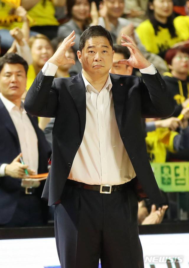 【인천=뉴시스】 고범준 기자 = 4일 오후 인천 부평구 인천삼산월드체육관에서 열린 2018-2019 SKT 5GX 프로농구 4강 플레이오프(5전 3승제) 1차전 인천 전자랜드와 창원 LG의 경기, 창원 현주엽 감독이 선수들에게 작전 지시를 하고 있다. 2019.04.04.