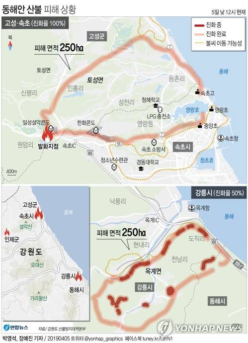 이와 함께 25㏊의 산림을 태운 인제산불은 50%의 진화율을, 110㏊의 산림을 잿더미로 만든 강릉 옥계산불은 20%의 진화율을 각각 보인다고 산림청은 설명했다.