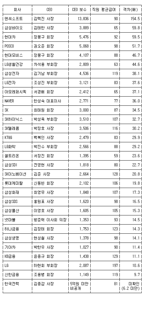 CEO 연봉이 일반 직원의 평균 약 30.3배에 달한 셈이다.
