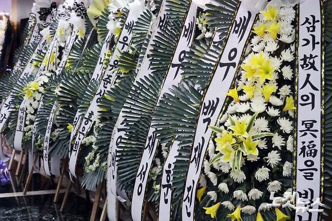 5일 오후 폐암 투병 끝에 별세한 배우 이일재의 빈소가 마련된 서울 서초구 가톨릭대학교 서울성모병원에 동료 배우들의 근조화환이 놓여 있다. (사진공동취재단)