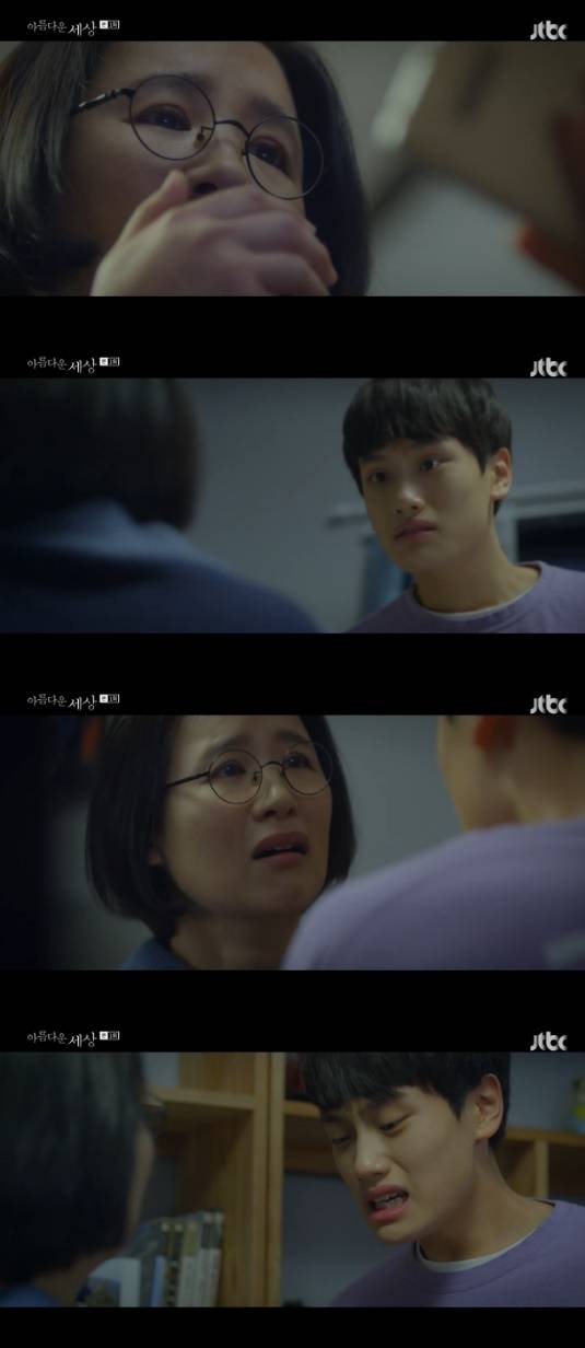 5일 방송된 종합편성채널 JTBC 새 금토드라마 '아름다운 세상' 1회에서는 박무진(박희순 분), 강인하(추자현)가 아들 선호(남다름)가 뇌사일 확률이 있단 사실에 충격을 받았다.