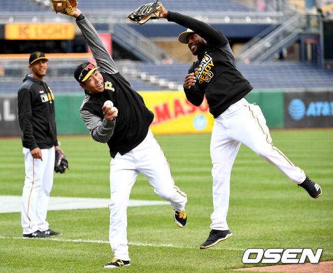 [OSEN=피츠버그(미국 펜실베이니아주), 최규한 기자] 6일(한국시간) 미국 펜실베이니아주 피츠버그 PNC파크에서 열리는 ’2019 메이저리그’ 피츠버그 파이어리츠와 신시내티 레즈와의 경기를 앞두고, 피츠버그 강정호와 팀 동료 스탈링 마르테가 캐치볼 훈련을 하며 장난을 치고 있다. /dreamer@osen.co.kr