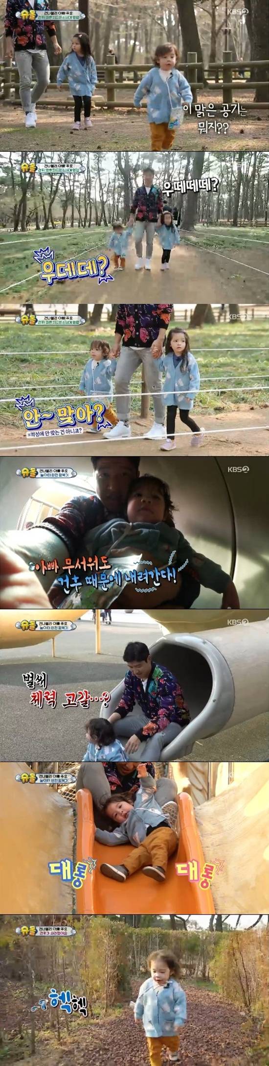 박주호와 건나블리 남매 앞에 용 모양을 한 미끄럼틀 기구가 나타났다. 키즈카페에서 미끄럼틀을 경험한 건후는 미끄럼틀을 타고 싶어 했다. 박주호는 무섭지만 건후를 안고 함께 미끄럼틀을 탔다.