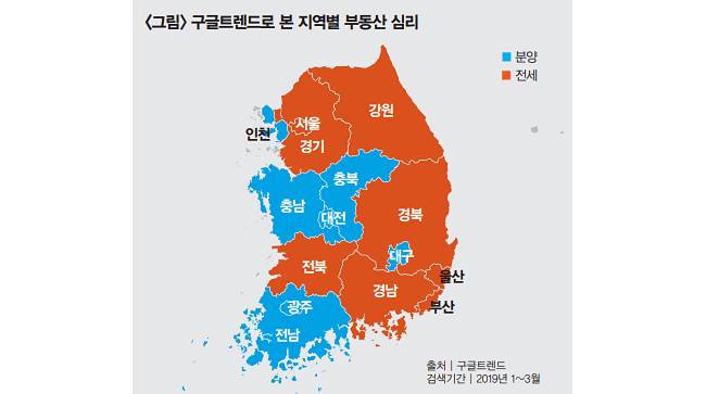 ![주 | 2014년 1월~2019년 3월 검색량 중 가장 높은 검색량을 100으로 해 표준화 수치로 나타낸 것. 파란색은 ‘분양’ 검색량 수치, 붉은색은 ‘전세’ 검색량 수치. 주택 가격 변동률은 전분기 대비 [출처 | 구글트렌드, 부동산114]](https://img1.daumcdn.net/thumb/R658x0.q70/?fname=https://t1.daumcdn.net/news/201904/08/weeklydonga/20190408110010179wrfk.jpg)