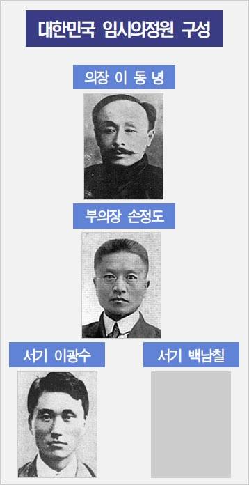 정부 수립에 이어 입법기관도 출범시켰다. 조소앙의 제안대로 기구의 명칭은 '임시의정원'. 무기명 투표로 초대 임시의정원 의장에 이동녕, 부의장에는 손정도, 서기에는 이광수와 백남칠이 각각 뽑혔다.