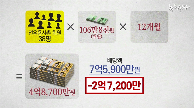 전우용사촌의 회원수는 38명. 이들에게 월평균 106만8000원을 12개월동안 지급할 경우 전체 배당금은 4억8700만 원이다. 전우용사촌이 지급했다는 배당금 총액 7억5900만 원보다 2억7200만 원의 차이가 난다.