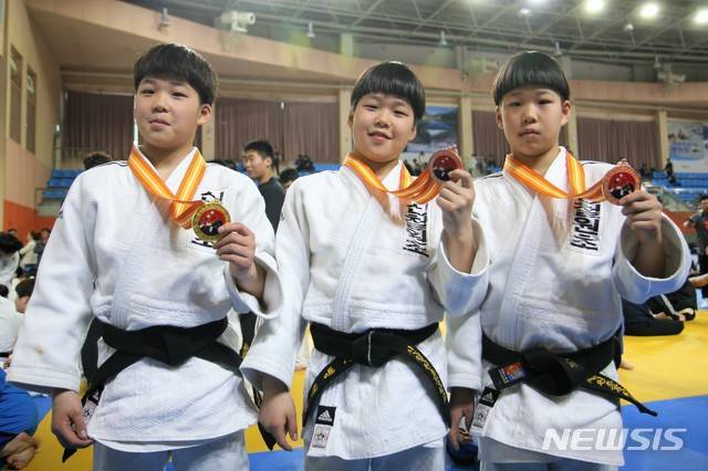 【철원=뉴시스】 박종우 기자 = 13일 오후 강원 철원군 철원실내체육관에서 제47회 춘계 전국 초·중·고 유도연맹전이 펼쳐진 가운데 강원 철원군 신철원초등학교 5학년 세쌍둥이 전민성(왼쪽부터·42㎏급 1위), 전민균(42㎏급 3위), 전민형(36㎏급 3위) 형제가 메달을 걸고 즐거워하고 있다. 2019.04.13.