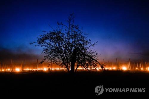 epaselect epa07507799 Anti-frost candles burn in a vineyard, during a cold spring night in the Weinboehla near Dresden, Germany, early 15 April 2019. Due to unusually low temperatures wine growers from vineyards of Schloss Wackerbarth try to protect their grape shoots with anti-frost candles. This year spring was hit by unusually warm temperatures and then the late frost can destroy the harvest. EPA/FILIP SINGER ATTENTION: This Image is part of a PHOTO SET