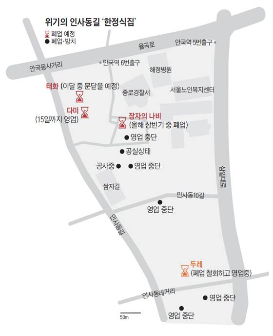 인사동에서 32년간 한정식집 '다미'를 운영해 오던 안정숙(63)씨는 15일 마지막 영업을 했다. 안씨는 "최근 2~3년 사이 손님은 절반 이상 줄어들었는데 인건비는 크게 올라 도저히 버틸 수가 없었다"고 했다.