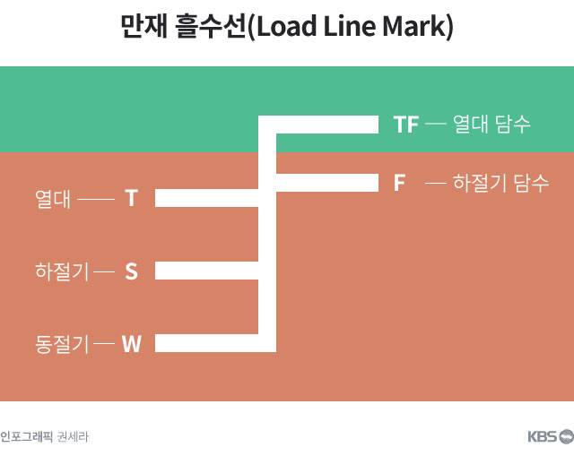 가득 싣는 최대한도를 '만재 흘수'라고 해서 배에 눈금으로 표시되고 있습니다. 그림을 보면 만재 흘수선(Load line Mark)은 일단 바다(해수)와 민물(담수)로 나뉘고, 또 해역과 계절에 따라 나누어져 있습니다.