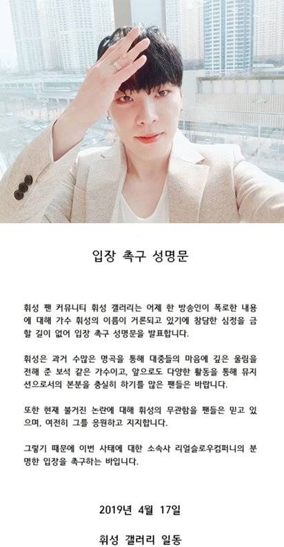 파장이 커지자 휘성 팬들은 휘성의 분명한 입장을 촉구했다. 휘성 팬 커뮤니티인 디시인사이드의 휘성 갤러리는 17일 "한 방송인이 폭로한 내용에 대해 가수 휘성의 이름이 거론되고 있기에 참담한 심정을 금할 길이 없어 입장 촉구 성명문을 발표한다"고 밝혔다.