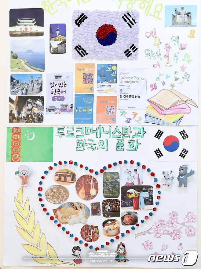 17일(현지시간) 국빈 방문중인 김정숙 여사가 방문한 투르크메니스탄 아시가바트 아자디 투르크멘 국립 세계언어대학교 한국어 수업 교실에 태극기를 중심으로 광화문 세종대왕 동상 사진등이 있는 붙여있다. (청와대 페이스북)2019.4.18/뉴스1