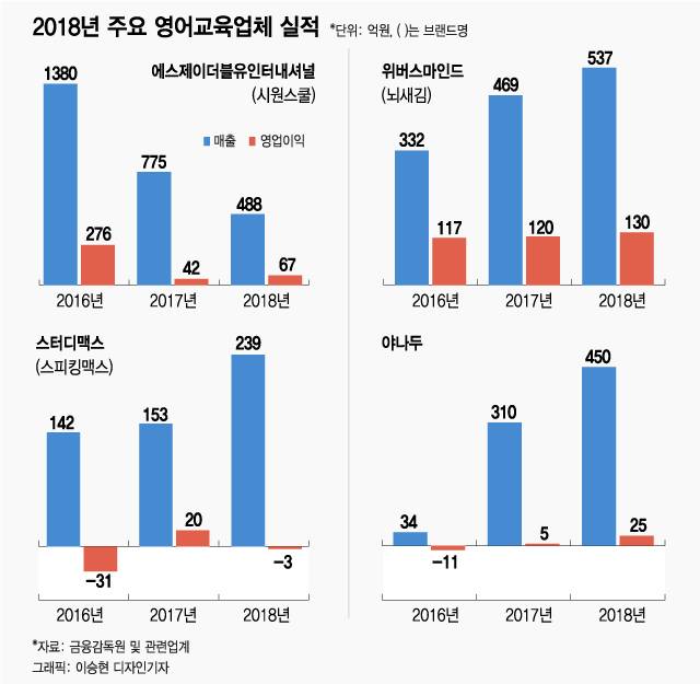 현지체험 영어브랜드 ‘스피킹맥스’를 운영하는 스터디맥스는 매출은 늘었지만 수익성이 뒷걸음질했다. 지난해 매출은 239억원으로 전년(153억원)보다 56% 증가했다. 하지만 영업손실 3억8100만원, 당기순손실 6억4000만원을 기록하며 적자전환했다. 광고 등 비용지출이 급격히 늘어난 것이 발목을 잡았다. 영어교육시장의 지각변동은 한동안 계속될 것으로 전망된다.