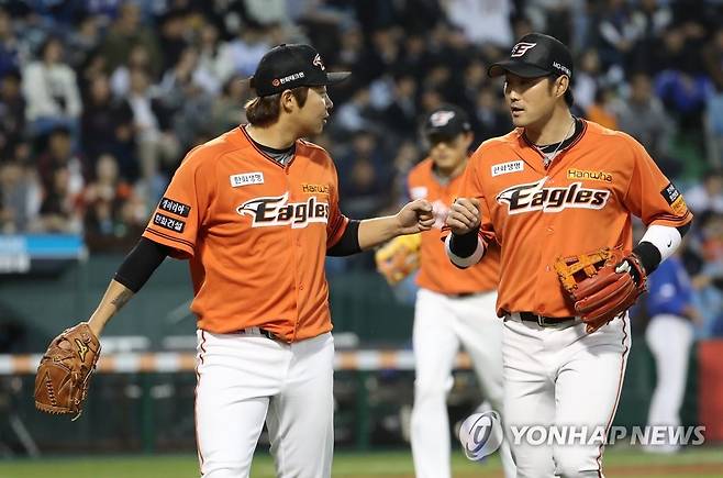 (대전=연합뉴스) 김준범 기자 = 19일 대전 한화생명 이글스파크에서 열린 프로야구 삼성라이온즈와 한화이글스의 경기. 2회말 만루 위기를 넘긴 한화 투수 김범수가 송광민과 주먹을 부딪히고 있다. 2019.4.19