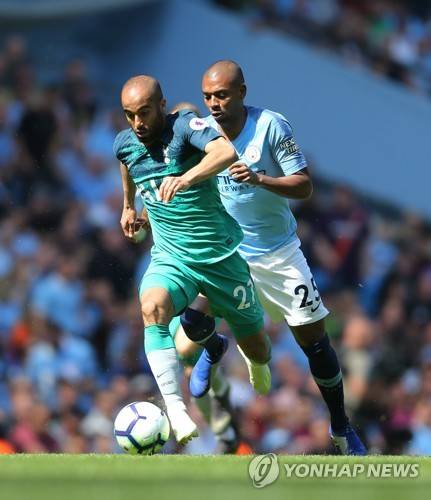epa07517398 Manchester City's Fernandinho (R) vies for the ball against Tottenham Hotspur's Lucas Moura (L) during the English Premier League soccer match between Manchester City and Tottenham Hotspur at the Etihad Stadium in Manchester, Britain, 20 April 2019. EPA/NIGEL RODDIS EDITORIAL USE ONLY. No use with unauthorized audio, video, data, fixture lists, club/league logos or 'live' services. Online in-match use limited to 120 images, no video emulation. No use in betting, games or single club/league/player publications.
