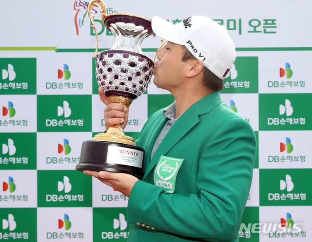 【서울=뉴시스】김진아 기자 = 21일 경기 포천 대유몽베르CC에서 열린 제15회 DB손해보험 프로미 오픈 대회에서 우승을 차지한 이태훈이 트로피와 포즈를 취하고 있다. 2019.04.21. (사진=KPGA 제공)