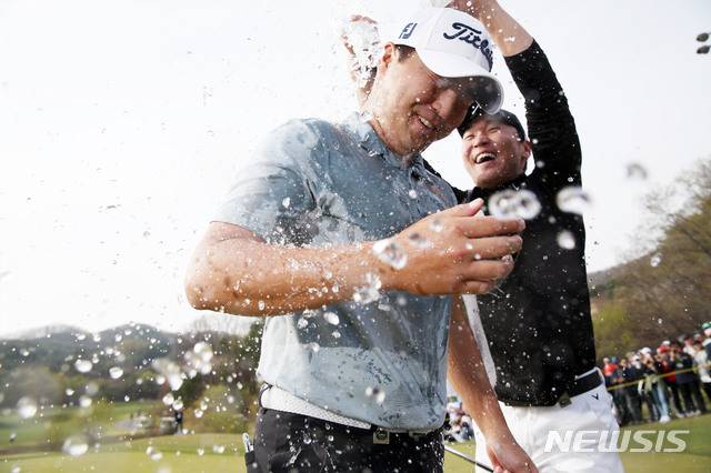 【서울=뉴시스】김진아 기자 = 21일 경기 포천 대유몽베르CC에서 열린 제15회 DB손해보험 프로미 오픈 대회에서 우승을 차지한 이태훈이 축하를 받고 있다. 2019.04.21. (사진=KPGA 제공)