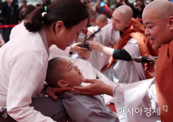 부처님오신날을 3주 가량 앞둔 22일 서울 종로구 조계사에서 열린 동자승 삭발 및 수계식에서 한 동자승이 투정을 부리고 있다./김현민 기자 kimhyun81@