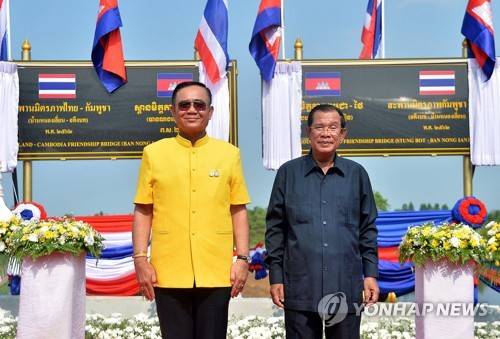 epa07520991 A handout photo made available by the Royal Thai Government shows Thailand's Prime Minister Prayut Chan-o-cha (L) and Cambodian Prime Minister Hun Sen (R) posing for photos duirng ceremony to celebrate the successful completion of the Thai-Cambodian Friendship Bridge (Ban Nong Ian-Sateung Bot) as they stand in the middle of the bridge, near the Thai-Cambodian border, Thailand, 22 April 2019. Cambodia and Thailand launched cross border trains that will run between Poipet train station in Cambodia and Ban Khlong Luek train station in Thailand. EPA/ROYAL THAI GOVERNMENT HANDOUT HANDOUT EDITORIAL USE ONLY/NO HANDOUT EDITORIAL USE ONLY/NO SALES