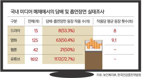 인기 드라마, 영화, 유튜브 등에서 담배나 흡연 장면이 무분별하게 쏟아지고 있다. 작품이나 영상 2개 중 1개꼴에서 담배 장면을 볼 수 있다. 청소년들이 아무런 제한 없이 이들 매체에서 내보내는 담배·흡연 장면에 노출되고 있어 규제가 필요하다는 목소리가 커지고 있다.