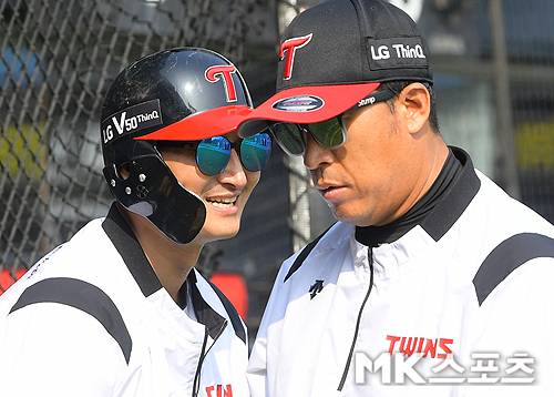 LG 박용택, 이병규 코치가 훈련을 준비하며 이야기를 나누고 있다. jh1000@maekyung.com