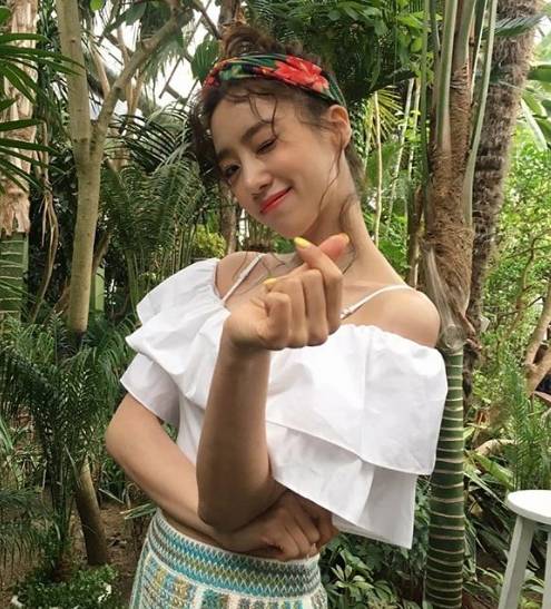 사진 속 함은정은 여름 분위기가 물씬 느껴지는 화이트 오프숄더 상의와 롱치마를 입고 귀여운 손하트 포즈를 취했다.