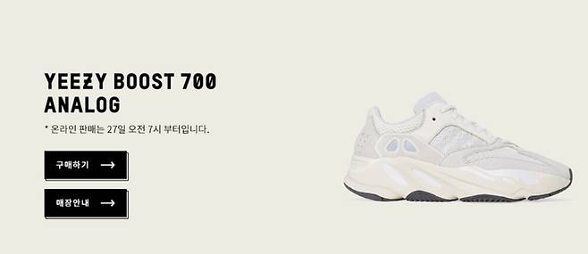 아디다스 공식 홈페이지를 향한 관심이 뜨겁다.‘이지부스트 700 아날로그(YEEZY BOOST 700 ANALOG)’가 27일 발매되기 때문.