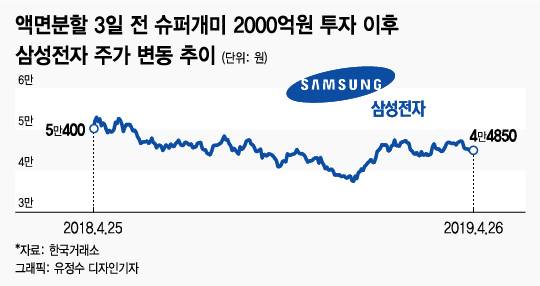 그런데 개미들의 기대와는 달리 삼성전자는 액면분할 이후 주가가 한 번도 오르지 못하고 계속 액면분할 직전 종가인 5만3000원 아래에서 맴돌았다. 액면분할 1주년이 되는 날 삼성전자 주가(4월 26일 종가 4만4850원)는 1년 전보다 15.4%나 낮다. 슈퍼개미가 2000억원 베팅한 날 종가보단 11% 낮고, 액면분할을 발표한 날 종가와 비교하면 10.1% 낮은 수준이다.