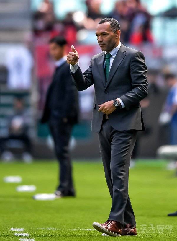 28일 전주월드컵경기장에서 ‘하나원큐 K리그1 2019’ 전북현대와 FC서울의 경기가 열렸다. 전북현대 모리야스 감독이 전반 선수들에게 엄지손가락을 내밀고 있다.